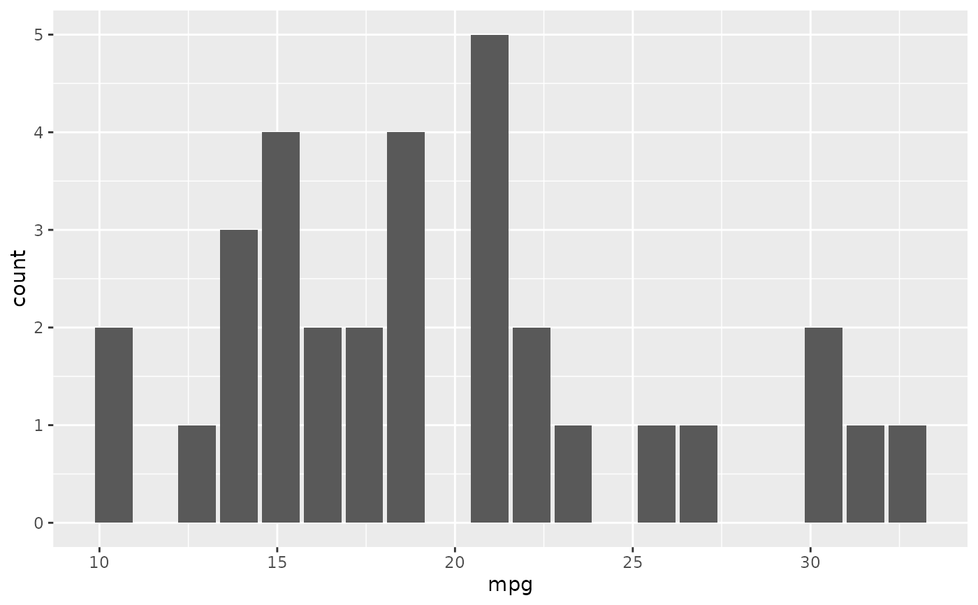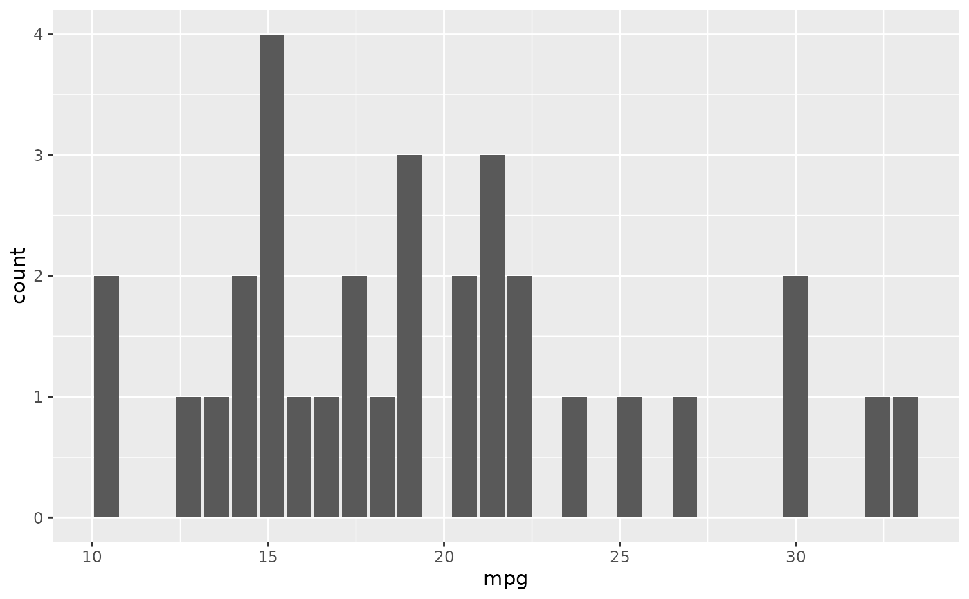ggplot2::geom_col(ggplot2::aes(mpg, count))